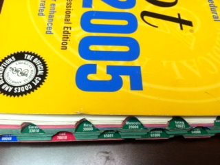 I found the CPT book from 2005 at my workplace and it used to have clearly labeled tabs on the side of the book, which I think makes finding the sections easier and quicker. Linda, are we allowed to write on temporary sticky tabs to label the CPT book like this for the certification exams?